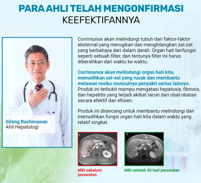 Obat ini mengandung sejumlah besar nutrisi untuk hati. Currimunox memiliki efek detoksifikasi yang nyata pada hati, secara signifikan mengurangi efek toksik pada hati, merangsang regenerasi sel hati, mengembalikan fungsi hati.